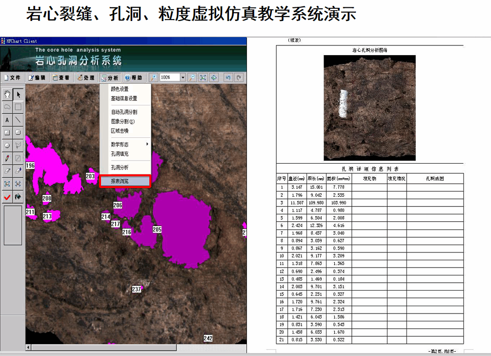 傳統(tǒng)實(shí)驗(yàn)由老師手持巖心實(shí)物、指導(dǎo)學(xué)生觀察、描述巖心。由于巖心實(shí)物匱乏,教學(xué)素材極其有限。通過虛擬仿真技術(shù),可以通過各大油田巖心庫收集國內(nèi)外巖心實(shí)物的數(shù)字圖像,結(jié)合計(jì)算機(jī)技術(shù)實(shí)現(xiàn)巖心孔洞、裂縫、粒度虛的擬仿真教學(xué)。通過數(shù)字圖像處理技術(shù)對(duì)巖心圖像進(jìn)行預(yù)處理,快速確定裂縫的邊界,達(dá)到巖心圖像處理和人機(jī)交互方式。研究巖心孔洞、裂縫、粒度圖像分析技術(shù),實(shí)現(xiàn)了自動(dòng)提取孔洞、裂縫、粒度目標(biāo),自動(dòng)統(tǒng)計(jì)計(jì)算相關(guān)參數(shù),并結(jié)合試驗(yàn)室常規(guī)物性測試和測井資料進(jìn)行參數(shù)分析評(píng)價(jià),從而解決了以往人工測定,測量數(shù)值存在較大誤差,而且費(fèi)工費(fèi)時(shí),轉(zhuǎn)化參數(shù)難度大等問題,深化了對(duì)巖心這一地質(zhì)基礎(chǔ)資料的應(yīng)用,對(duì)于裂縫、孔洞型油氣藏的勘探與開發(fā)具有重要意義。